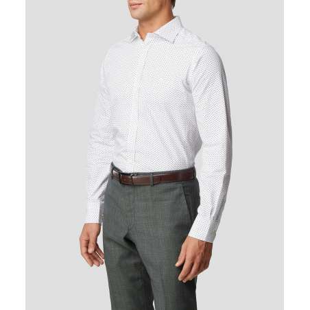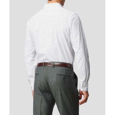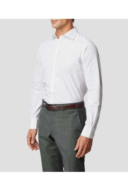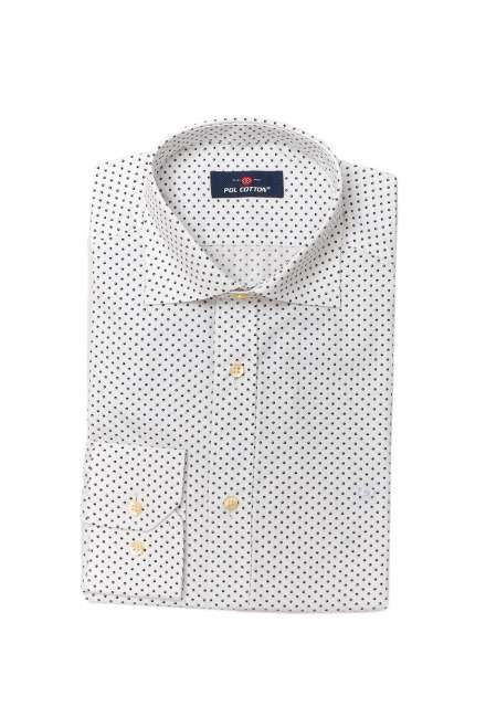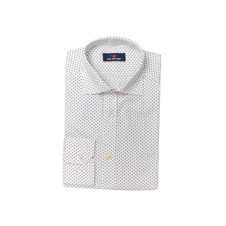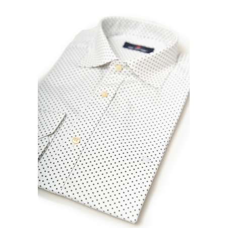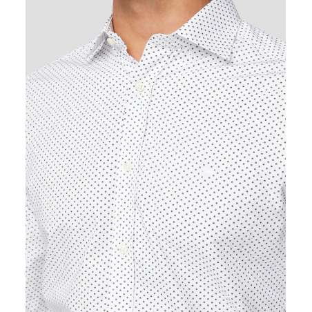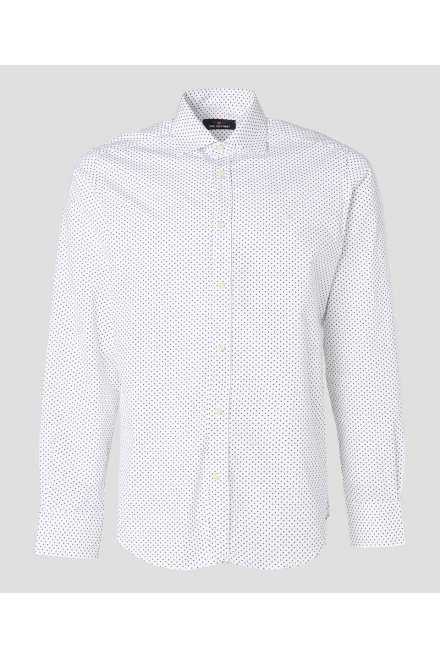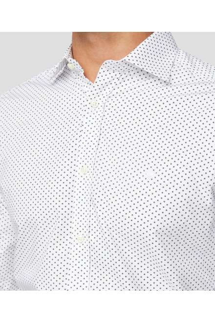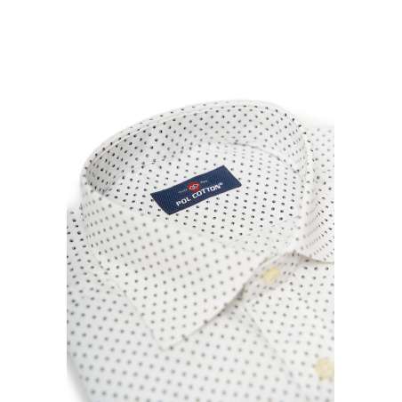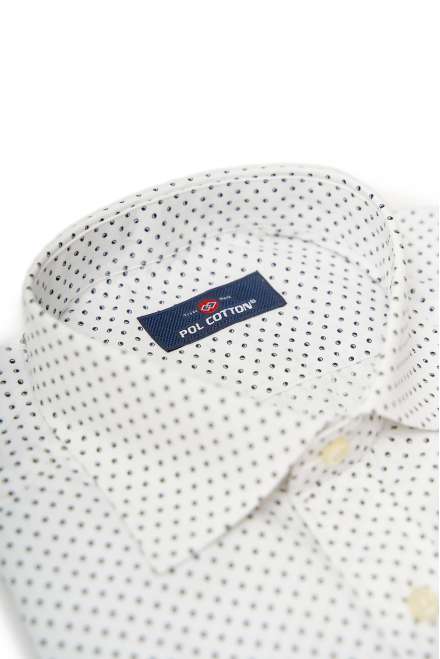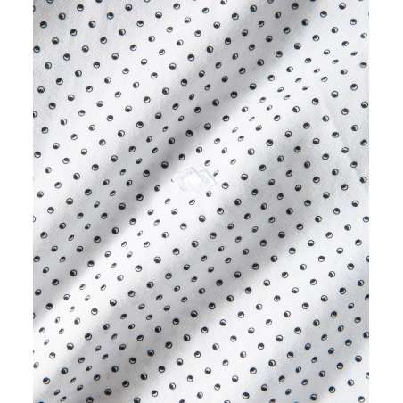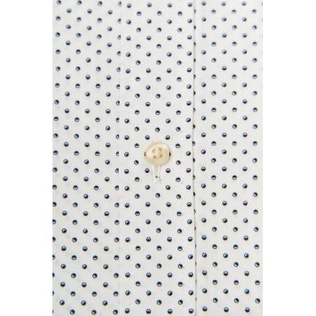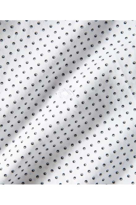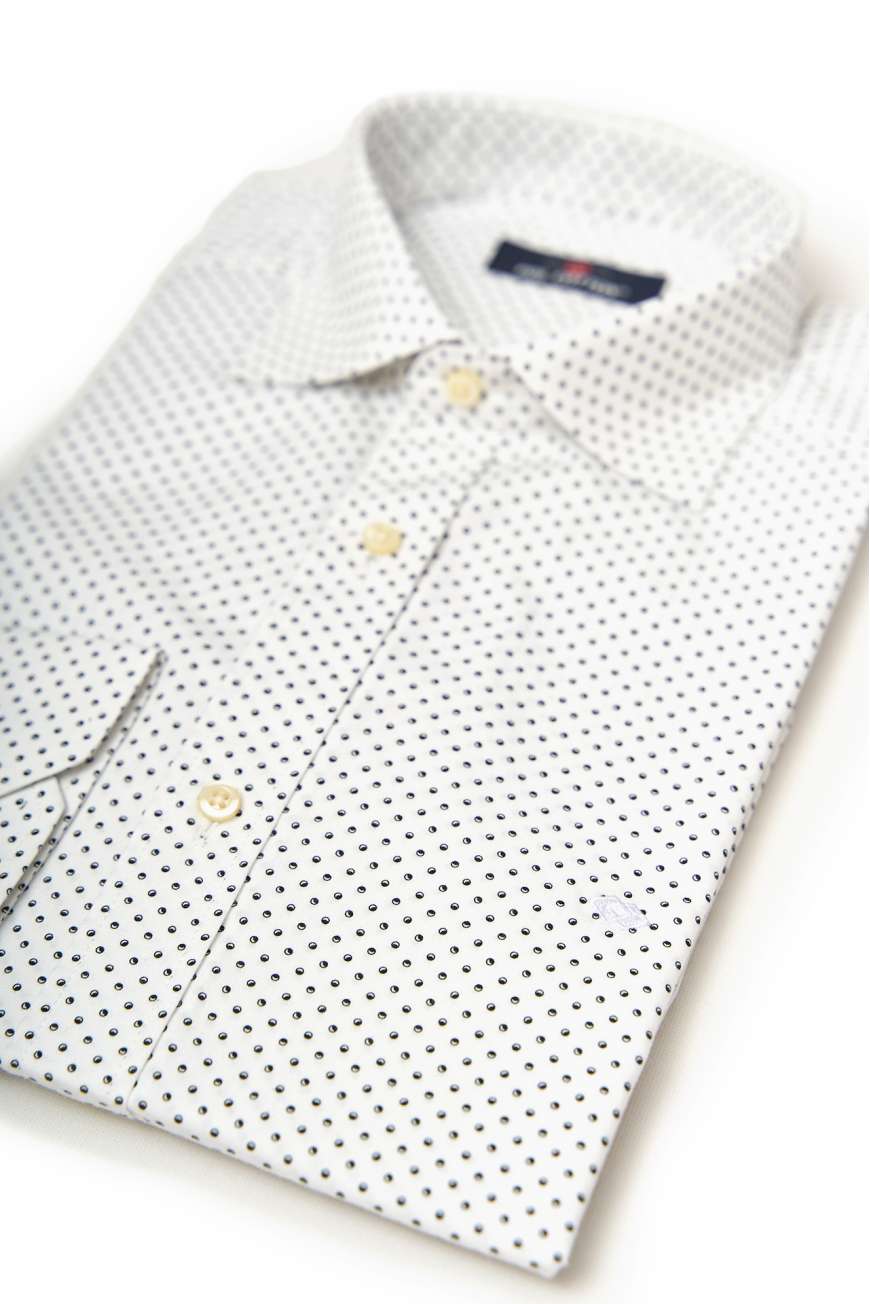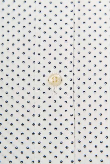Manga larga, círculos color negro sobre fondo blanco, cuello sin botones, sin bolsillo con detalle bordado de la marca, botones en blanco. Regular fit.